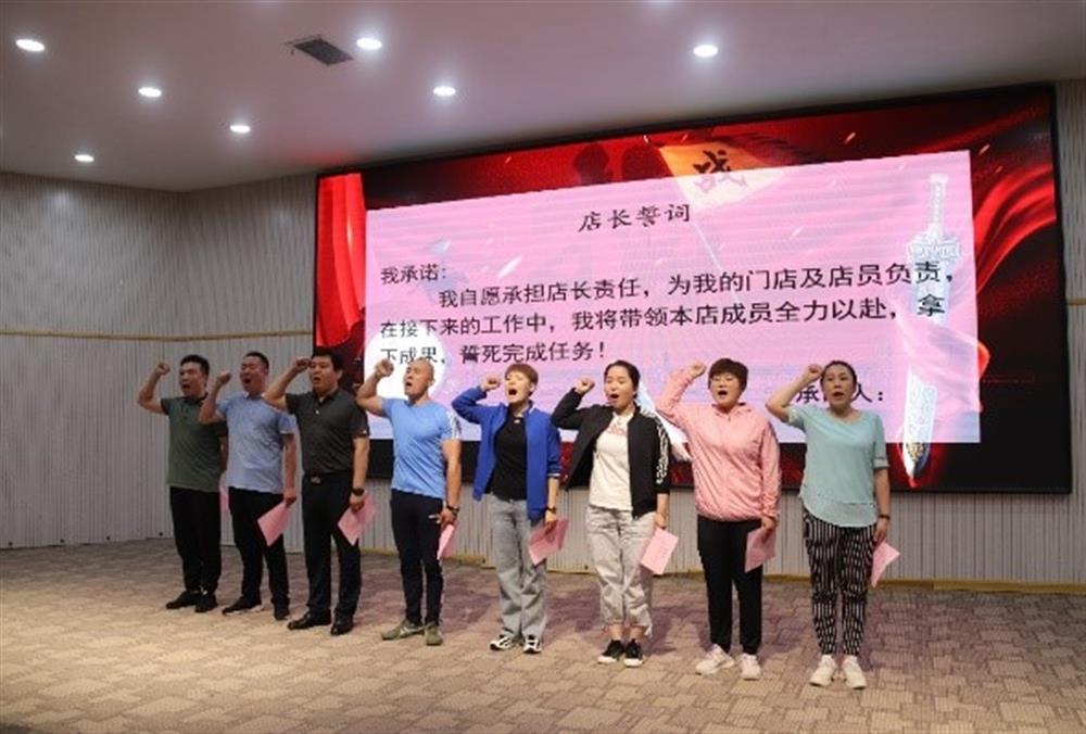竞拍店长举起右手,庄严宣誓。我承诺:“我自愿承担店长责任,为我的门店及店员负责,在接下来的工作中,我将带领本店成员全力以赴,拿下成果,誓死拿下任务”!句句铿锵有力,字字掷地有声,许下不辱使命的承诺,扛起不负众望的担当。