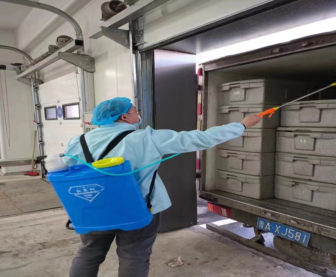 为保证食品安全和员工自身安全,金德利团餐公司、供应链公司每天都坚持消毒环节的打卡监督管理。进入公司园区的车辆严格进行消杀,大喷雾器对进出车辆进行消杀、登记;对接车间具体负责人安排专人对食品箱进行消杀。