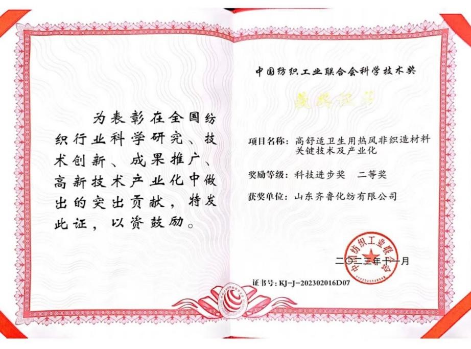 12月6日上午,2023年度中国纺织工业联合会科学技术奖励大会在北京人民大会堂隆重召开。齐鲁化纤集团山东齐鲁化纺有限公司与天津工业大学产学研团队共同开发的“高舒适卫生用热风非织造材料关键技术及产业化”项目荣获2023年度中国纺织工业联合会科技进步奖二等奖,化纺公司副总经理唐元冰代表公司上台接受表彰。
