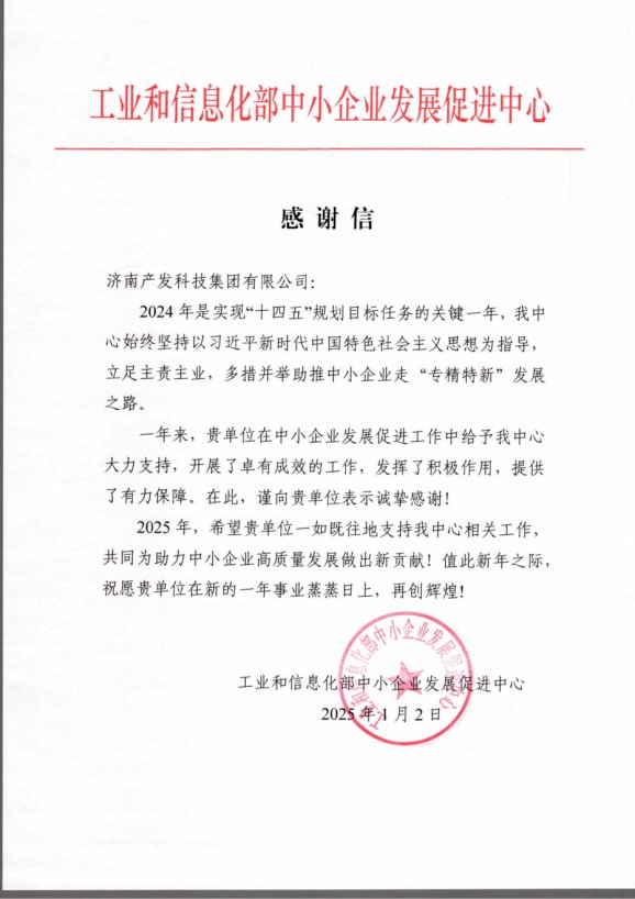 近日,bevictor伟德科技集团有限公司(以下简称“科技集团”)收到一封来自工业和信息化部中小企业发展促进中心(以下简称“促进中心”)的感谢信,信中对科技集团在2024年中小企业发展促进工作中发挥积极作用、提供有力保障表示由衷感谢。